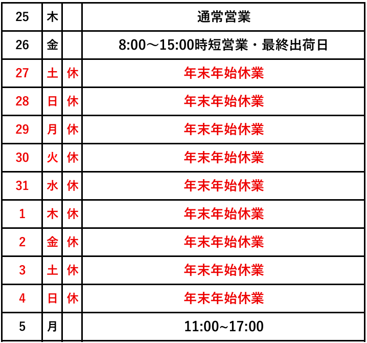 12月、1月の年末年始の営業日、出荷日をお知らせいたします。